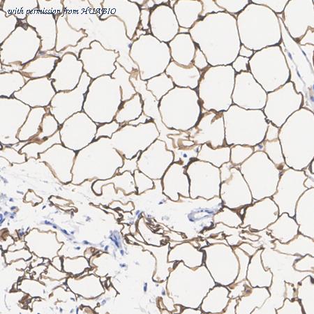 Immunohistochemical analysis of paraffin-embedded mouse adipose tissue with Rabbit anti-SCD1 antibody (HA723753) at 1/9,000 dilution. The section was pre-treated using heat mediated antigen retrieval with Tris-EDTA buffer (pH 9.0) for 20 minutes. The tissues were blocked in 1% BSA for 20 minutes at room temperature, washed with ddH2O and PBS, and then probed with the primary antibody (HA723753) at 1/9,000 dilution for 1 hour at room temperature. The detection was performed using an HRP conjugated compact polymer system. DAB was used as the chromogen. Tissues were counterstained with hematoxylin and mounted with DPX.