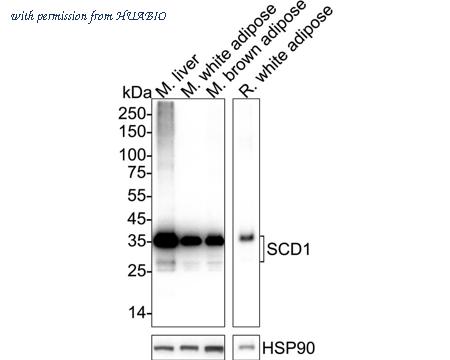 Western blot analysis of SCD1 on different lysates with Rabbit anti-SCD1 antibody (HA723753) at 1/5,000 dilution. Lane 1: Mouse liver tissue lysate Lane 2: Mouse white adipose tissue lysate Lane 3: Mouse brown adipose tissue lysate Lane 4: Rat white adipose tissue lysate Lysates/proteins at 20 µg/Lane. Predicted band size: 41 kDa Observed band size: 37/28 kDa Exposure time: 25 seconds; ECL: K1801; 4-20% SDS-PAGE gel. Proteins were transferred to a PVDF membrane and blocked with 5% NFDM/TBST for 1 hour at room temperature. The primary antibody (HA723753) at 1/5,000 dilution was used in primary antibody dilution (K1803) at 4℃ overnight. Goat Anti-Rabbit IgG - HRP Secondary Antibody (HA1001) at 1/50,000 dilution was used for 1 hour at room temperature.