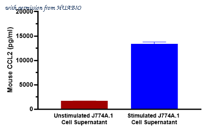 J774A.1 were stimulated with 20 ng/ml IFN-γ and 1 μg/ml LPS incubated for 1 day. The concentrations of CCL2 were measured in duplicate and interpolated from the CCL2 standard curves. Undiluted samples are IFN-γ and LPS stimulated J774A.1 cell culture supernatant 1.56% and unstimulated J774A.1 cell culture supernatant 50%. The mean CCL2 concentration was determined to be 13,358 pg/ml in IFN-γ and LPS stimulated J774A.1 cell culture supernatant and 1,679 pg/ml in the unstimulated J774A.1 cell culture supernatant.