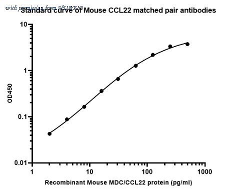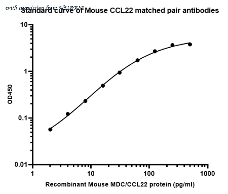 Sandwich ELISA analysis of mouse CCL22 matched pair antibodies Capture: HA723780, Mouse MDC/CCL22 Rabbit mAb [PSH15-76] Detector: HA723781, Mouse MDC/CCL22 Rabbit mAb [PSH15-77] Elisa assay was performed by coating wells of a 96-well plate with 100 µl per well of capture antibody MR240604-AA1341-1-1H9 or MR240604-AA1341-1-1C11 diluted in carbonate/bicarbonate buffer, at a concentration of 2ug/ml overnight at 4℃. Wells of the plate were washed, blocked with 150 µl 0.05% tween-20 1%BSA blocking buffer, and incubated with serial diluted mouse CCL22 protein (HA211072) starting from 500 pg/ml to 0 pg/ml and detect antibody MR240604-AA1341-1-1E2 -Biotin (0.2 µg/ml) for 1 hour at 30℃ with shaking. Then the plate was washed and incubated with 100 µl per well of SA-HRP for 0.5 hour at 30℃ with shaking. Detection was performed using an Ultra TMB Substrate for 10 minutes at room temperature in the dark. The reaction was stopped with sulfuric acid and absorbances were read on a spectrophotometer at 450 nm.