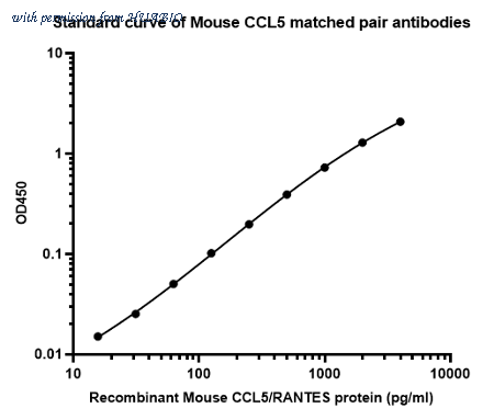 Sandwich ELISA analysis of mouse CCL5 matched pair antibodies Capture: HA725046, Mouse CCL5/RANTES Rabbit mAb [PSH14-15] Detector: HA725047, Mouse CCL5/RANTES Rabbit mAb [PSH14-16] Elisa assay was performed by coating wells of a 96-well plate with 100 µl per well of capture antibody (HA725046) diluted in carbonate/bicarbonate buffer, at a concentration of 2ug/ml overnight at 4℃. Wells of the plate were washed, blocked with 150 µl 0.05% tween-20 1%BSA blocking buffer, and incubated with serial diluted Recombinant Mouse CCL5/RANTES protein (HA211095) starting from 4,000 pg/ml to 0 pg/ml and detect antibody (HA725047, Biotin, 0.2 µg/ml) for 1 hour at 30℃ with shaking. Then the plate was washed and incubated with 100 µl per well of SA-HRP for 0.5 hour at 30℃ with shaking. Detection was performed using an Ultra TMB Substrate for 10 minutes at room temperature in the dark. The reaction was stopped with sulfuric acid and absorbances were read on a spectrophotometer at 450 nm.