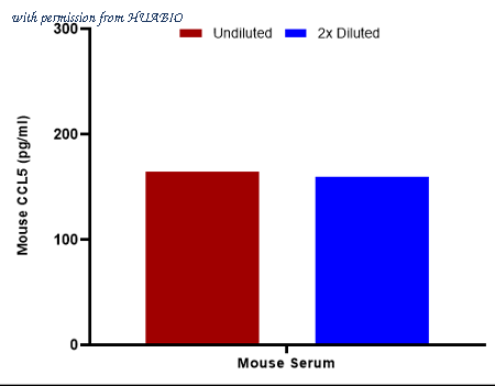 Interpolated concentrations of native CCL5 in mouse samples. Capture: HA725046, Mouse CCL5/RANTES Rabbit mAb [PSH14-15] Detector: HA725047, Mouse CCL5/RANTES Rabbit mAb [PSH14-16] Interpolated concentration of native CCL5 was measured in duplicate at different sample concentrations and interpolated from the CCL5 standard curves. Undiluted samples were 100% mouse serum. The mean CCL5 concentration was determined to be 162 pg/mL in mouse serum.