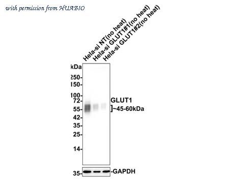 Western blot analysis of GLUT1 on different lysates with Rabbit anti-GLUT1 antibody (HA750002) at 1/50,000 dilution. Lane 1: Hela-si NT cell lysate (no heat) Lane 2: Hela-si GLUT1#1 cell lysate (no heat) Lane 3: Hela-si GLUT1#2 cell lysate (no heat) Notice: no heat means the lysate is not boiled. Lysates/proteins at 10 µg/Lane. Predicted band size: 54 kDa Observed band size: 45-60 kDa Exposure time: 1minute 50 seconds; ECL: K1801; 4-20% SDS-PAGE gel. ET1601-10 was shown to specifically react with GLUT1 in Hela-si NT cells. Weakened band was observed when Hela-si GLUT1 sample was tested. Hela-si NT and Hela-si GLUT1 samples were subjected to SDS-PAGE. Proteins were transferred to a PVDF membrane and blocked with 5% NFDM in TBST for 1 hour at room temperature. The primary antibody (ET1601-10, 1/50,000) and Loading control antibody (Rabbit anti-GAPDH, ET1601-4, 1/10,000) were used in 5% BSA at 4℃ overnight. Goat Anti-rabbit IgG-HRP Secondary Antibody (HA1001) at 1:50,000 dilution was used for 1 hour at room temperature.