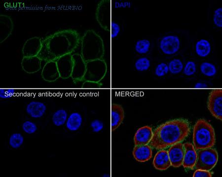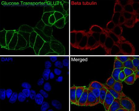 Immunocytochemistry analysis of MDA-MB-468 cells labeling Glucose Transporter GLUT1 with Rabbit anti-Glucose Transporter GLUT1 antibody (HA720154F) at 1/100 dilution. Cells were fixed in 4% paraformaldehyde for 10 minutes, permeabilized with 0.1% Triton X-100 in PBS for 15 minutes, and then blocked with 2% normal goat serum for 1 hour at 37 ℃. Cells were then incubated with Rabbit anti-Glucose Transporter GLUT1 antibody (HA720154F) at 1/100 dilution in 2% normal goat serum overnight at 4 ℃. Nuclear DNA was labelled in blue with DAPI. Beta tubulin (M1305-2, red) was stained at 1/200 dilution overnight at +4℃. Goat Anti-Mouse IgG H&L (iFluor™ 594, HA1126) were used as the secondary antibody at 1/800 dilution.