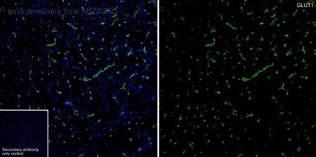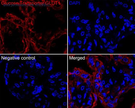 Immunofluorescence analysis of paraffin-embedded human placenta tissue labeling Glucose Transporter GLUT1 (HA720154F). The section was pre-treated using heat mediated antigen retrieval with Tris-EDTA buffer (pH 9.0) for 20 minutes. The tissues were blocked in 10% negative goat serum for 1 hour at room temperature, washed with PBS. And then probed with the primary antibody Glucose Transporter GLUT1 (HA720154F, iFluor™ 488) at 1/50 dilution overnight at 4 ℃, washed with PBS. DAPI was used as nuclear counterstain.