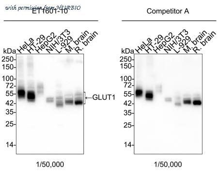 Western blot analysis of Glucose Transporter GLUT1 on different lysates with Rabbit anti-Glucose Transporter GLUT1 antibody (ET1601-10) at 1/50,000 dilution and competitor's antibody at 1/50,000 dilution. Lane 1: HeLa cell lysate (no heat) (20 µg/Lane) Lane 2: HT-29 cell lysate (no heat) (20 µg/Lane) Lane 3: HepG2 cell lysate (no heat) (20 µg/Lane) Lane 4: NIH/3T3 cell lysate (no heat) (20 µg/Lane) Lane 5: L-929 cell lysate (no heat) (20 µg/Lane) Lane 6: Mouse brain tissue lysate (no heat) (20 µg/Lane) Lane 7: Rat brain tissue lysate (no heat) (20 µg/Lane) Notice: no heat means the lysate is not boiled. Predicted band size: 54 kDa Observed band size: 45-60 kDa Exposure time: Lane 1-7 (left): 20 seconds; Lane 1-7 (right): 1 minute 30 seconds; ECL: K1801; 4-20% SDS-PAGE gel. Proteins were transferred to a PVDF membrane and blocked with 5% NFDM/TBST for 1 hour at room temperature. The primary antibody (ET1601-10) at 1/50,000 dilution and competitor's antibody at 1/50,000 dilution were used in 5% NFDM/TBST at 4℃ overnight. Goat Anti-Rabbit IgG - HRP Secondary Antibody (HA1001) at 1/50,000 dilution was used for 1 hour at room temperature.