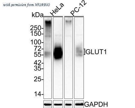 Western blot analysis of Glucose Transporter GLUT1 on different lysates with Rabbit anti-Glucose Transporter GLUT1 antibody (HA750002) at 1/50,000 dilution. Lane 1: HeLa cell lysate (RIPA lysis) (10 µg/Lane) Lane 2: HeLa cell lysate (hot lysis) (10 µg/Lane) Lane 3: PC-12 cell lysate (RIPA lysis) (10 µg/Lane) Lane 4: PC-12 cell lysate (hot lysis) (10 µg/Lane) Predicted band size: 54 kDa Observed band size: 54 kDa Exposure time: 30 seconds; ECL: K1801; 4-20% SDS-PAGE gel. Proteins were transferred to a PVDF membrane and blocked with 5% NFDM/TBST for 1 hour at room temperature. The primary antibody (HA750002) at 1/50,000 dilution was used in 5% NFDM/TBST at room temperature for 2 hours. Goat Anti-Rabbit IgG - HRP Secondary Antibody (HA1001) at 1/100,000 dilution was used for 1 hour at room temperature.