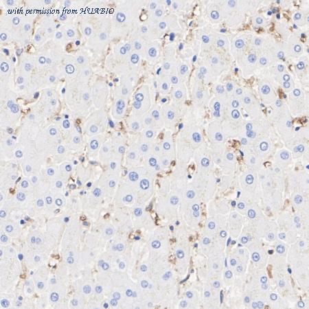 Immunohistochemical analysis of paraffin-embedded mouse liver tissue with Rat anti-Glucose Transporter GLUT1 antibody (HA601521) at 1/2,000 dilution. The section was pre-treated using heat mediated antigen retrieval with Tris-EDTA buffer (pH 9.0) for 20 minutes. The tissues were blocked in 1% BSA for 20 minutes at room temperature, washed with ddH2O and PBS, and then probed with the primary antibody (HA601521) at 1/2,000 dilution for 1 hour at room temperature. The detection was performed using an HRP conjugated compact polymer system. DAB was used as the chromogen. Tissues were counterstained with hematoxylin and mounted with DPX.
