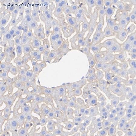 Immunohistochemical analysis of paraffin-embedded mouse liver tissue with Rat anti-Glucose Transporter GLUT1 antibody (HA610348) at 1/2,000 dilution. The section was pre-treated using heat mediated antigen retrieval with Tris-EDTA buffer (pH 9.0) for 20 minutes. The tissues were blocked in 1% BSA for 20 minutes at room temperature, washed with ddH2O and PBS, and then probed with the primary antibody (HA610348) at 1/2,000 dilution for 1 hour at room temperature. The detection was performed using an HRP conjugated compact polymer system. DAB was used as the chromogen. Tissues were counterstained with hematoxylin and mounted with DPX.