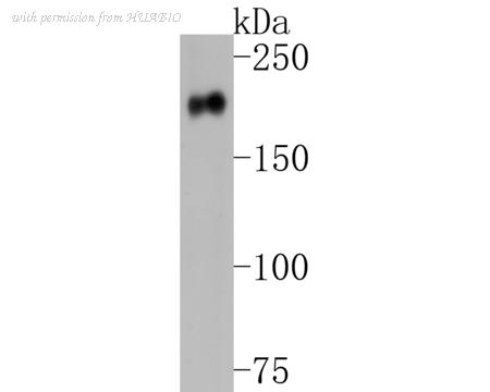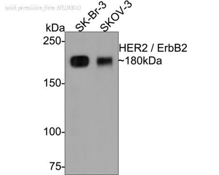 Western blot analysis of HER2 / ErbB2 on different lysates with Rabbit anti-HER2 / ErbB2 antibody (ER0106) at 1/1,000 dilution. Lane 1: SK-Br-3 cell lysate Lane 2: SKOV-3 cell lysate Lysates/proteins at 10 µg/Lane. Predicted band size: 138 kDa Observed band size: 180 kDa Exposure time: 2 minutes; 6% SDS-PAGE gel. Proteins were transferred to a PVDF membrane and blocked with 5% NFDM/TBST for 1 hour at room temperature. The primary antibody (ER0106) at 1/1,000 dilution was used in 5% NFDM/TBST at room temperature for 2 hours. Goat Anti-Rabbit IgG - HRP Secondary Antibody (HA1001) at 1:300,000 dilution was used for 1 hour at room temperature.
