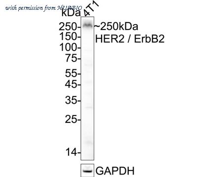 Western blot analysis of HER2 / ErbB2 on 4T1 cell lysates with Rabbit anti-HER2 / ErbB2 antibody (ER0106) at 1/1,000 dilution. Lysates/proteins at 20 µg/Lane. Predicted band size: 138 kDa Observed band size: 250 kDa Exposure time: 25 seconds; ECL: K1801; 4-20% SDS-PAGE gel. Proteins were transferred to a PVDF membrane and blocked with 5% NFDM/TBST for 1 hour at room temperature. The primary antibody (ER0106) at 1/1,000 dilution was used in 5% NFDM/TBST at 4℃ overnight. Goat Anti-Rabbit IgG - HRP Secondary Antibody (HA1001) at 1/50,000 dilution was used for 1 hour at room temperature.