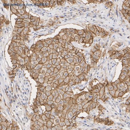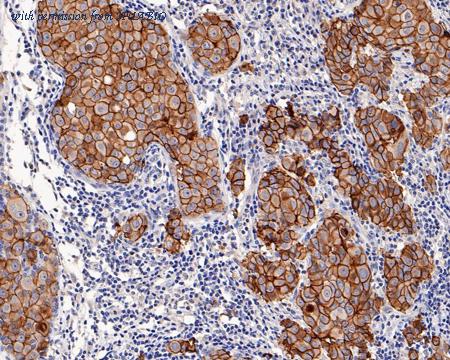Immunohistochemical analysis of paraffin-embedded human breast carcinoma tissue with Rabbit anti-HER2 / ErbB2 antibody (HA721210) at 1/4,000 dilution. The section was pre-treated using heat mediated antigen retrieval with Tris-EDTA buffer (pH 9.0) for 20 minutes. The tissues were blocked in 1% BSA for 20 minutes at room temperature, washed with ddH2O and PBS, and then probed with the primary antibody (HA721210) at 1/4,000 dilution for 1 hour at room temperature. The detection was performed using an HRP conjugated compact polymer system. DAB was used as the chromogen. Tissues were counterstained with hematoxylin and mounted with DPX.