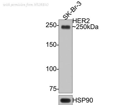 Western blot analysis of HER2 / ErbB2 on SK-Br-3 cell lysates with Rabbit anti-HER2 / ErbB2 antibody (HA721178) at 1/1,000 dilution. Lysates/proteins at 10 µg/Lane. Predicted band size: 138 kDa Observed band size: 250 kDa Exposure time: 2 minutes; 6% SDS-PAGE gel. Proteins were transferred to a PVDF membrane and blocked with 5% NFDM/TBST for 1 hour at room temperature. The primary antibody (HA721178) at 1/1,000 dilution was used in 5% NFDM/TBST at room temperature for 2 hours. Goat Anti-Rabbit IgG - HRP Secondary Antibody (HA1001) at 1:300,000 dilution was used for 1 hour at room temperature.