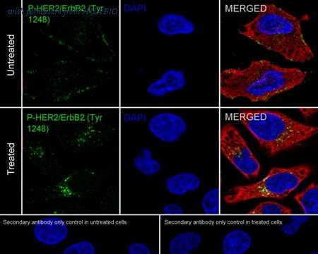 Immunocytochemistry analysis of HeLa cells starved for 4 hours add 200ng/mL EGF for 15 minutes labeling Phospho-HER2 / ErbB2 (Y1248) with Rabbit anti-Phospho-HER2 / ErbB2 (Y1248) antibody (HA722084) at 1/100 dilution. Cells were fixed in 4% paraformaldehyde for 20 minutes at room temperature, permeabilized with 0.1% Triton X-100 in PBS for 5 minutes at room temperature, then blocked with 1% BSA in 10% negative goat serum for 1 hour at room temperature. Cells were then incubated with Rabbit anti-Phospho-HER2 / ErbB2 (Y1248) antibody (HA722084) at 1/100 dilution in 1% BSA in PBST overnight at 4 ℃. Goat Anti-Rabbit IgG H&L (iFluor™ 488, HA1121) was used as the secondary antibody at 1/1,000 dilution. PBS instead of the primary antibody was used as the secondary antibody only control. Nuclear DNA was labelled in blue with DAPI. Beta tubulin (M1305-2, red) was stained at 1/100 dilution overnight at +4℃. Goat Anti-Mouse IgG H&L (iFluor™ 594, HA1126) was used as the secondary antibody at 1/1,000 dilution.