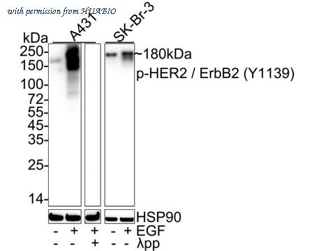 Western blot analysis of Phospho-HER2 / ErbB2 (Y1139) on different lysates with Rabbit anti-Phospho-HER2 / ErbB2 (Y1139) antibody (HA722201) at 1/1,000 dilution. Lane 1: A431 cell lysate Lane 2: A431 treated with 100ng/mL EGF for 10 minutes cell lysate Lane 3: A431 treated with 100ng/mL EGF for 10 minutes cell lysate, then the membrane treated with λpp for 1 hour Lane 4: SK-Br-3 cell lysate Lane 5: SK-Br-3 starved for 4 hours add 200ng/mL EGF for 15 minutes cell lysate Lysates/proteins at 20 µg/Lane. Predicted band size: 138 kDa Observed band size: 180 kDa Exposure time: 10 seconds; ECL: K1801; 4-20% SDS-PAGE gel. Proteins were transferred to a PVDF membrane and blocked with 5% NFDM/TBST for 1 hour at room temperature. The primary antibody (HA722201) at 1/1,000 dilution was used in 5% NFDM/TBST at 4℃ overnight. Goat Anti-Rabbit IgG - HRP Secondary Antibody (HA1001) at 1/50,000 dilution was used for 1 hour at room temperature.