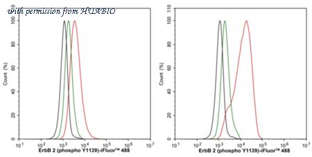 Flow cytometric analysis of A431 cells (left) and A431 cells treated with 100ng/mL EGF for 10 minutes (right) labeling Phospho-HER2 / ErbB2 (Y1139). Cells were fixed and permeabilized. Then stained with the primary antibody (HA722201, 1/10,000) (red) compared with Rabbit IgG Isotype Control (green). After incubation of the primary antibody at +4℃ for an hour, the cells were stained with a iFluor™ 488 conjugate-Goat anti-Rabbit IgG Secondary antibody (HA1121) at 1/1,000 dilution for 30 minutes at +4℃. Unlabelled sample was used as a control (cells without incubation with primary antibody; black).