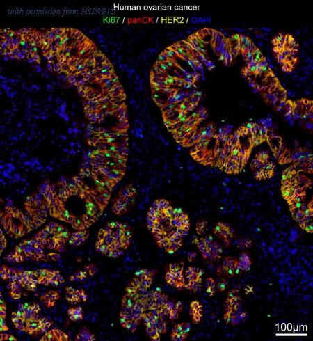 mIHC analysis of human ovarian cancer tissue (Formalin/PFA-fixed paraffin-embedded sections) with Ki67 (IRS036), panCK (IRS010) and HER2 (IRS034) antibody at 1/100 dilution. The immunostaining was performed with the IRISKitCmTSA Kit (900802). Heat mediated antigen retrieval with Tris-EDTA buffer (pH 9.0) for 30 mins at 95℃. DAPI (blue) was used as a nuclear counter stain. Image acquisition was performed with Olympus VS200 Slide Scanner.