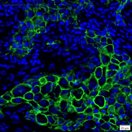 mIHC analysis of human biliary tract cancer tissue (Formalin/PFA-fixed paraffin-embedded sections) with Rabbit anti-HER2 / ErbB2 antibody (IRS034) at 1/100 dilution. The immunostaining was performed with the IRISKitCmTSA Kit (900808). Heat mediated antigen retrieval with Tris-EDTA buffer (pH 9.0) for 30 mins at 95℃. DAPI (blue) was used as a nuclear counter stain. Image acquisition was performed with Olympus VS200 Slide Scanner.