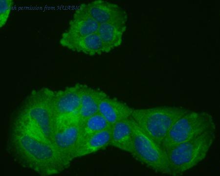 ICC staining of HER2 / ErbB2 in Hela cells (green). Formalin fixed cells were permeabilized with 0.1% Triton X-100 in TBS for 10 minutes at room temperature and blocked with 1% Blocker BSA for 15 minutes at room temperature. Cells were probed with the primary antibody (R1511-33, 1/50) for 1 hour at room temperature, washed with PBS. Alexa Fluor®488 Goat anti-Rabbit IgG was used as the secondary antibody at 1/1,000 dilution. The nuclear counter stain is DAPI (blue).