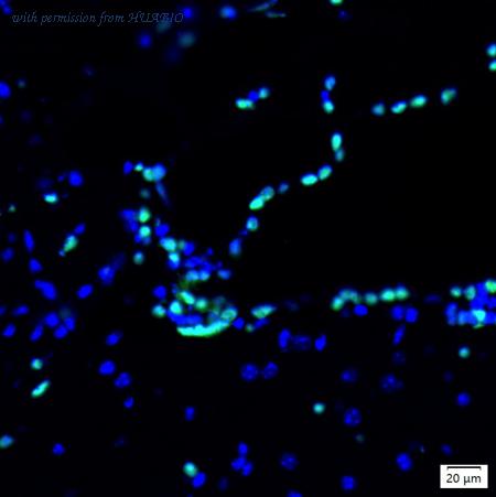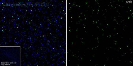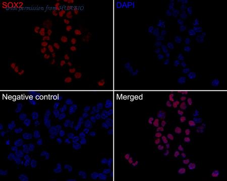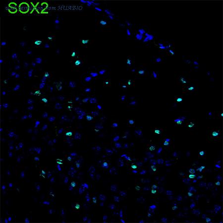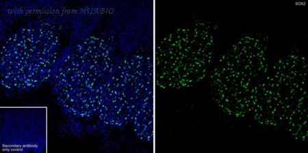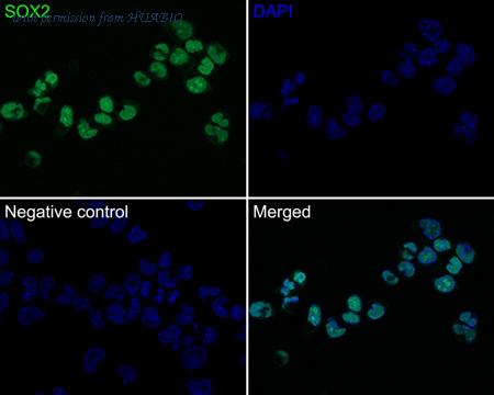 Immunocytochemistry analysis of F9 cells labeling SOX2 with Rabbit anti-SOX2 antibody (HA720180F) at 1/50 dilution. Cells were fixed in 100% methanol for 10 minutes, permeabilized with 0.1% Triton X-100 in PBS for 15 minutes, and then blocked with 1% BSA for 30 minutes at room temperature. Cells were then incubated with Rabbit anti-SOX2 antibody (HA720180F) at 1/50 dilution in 1% BSA overnight at 4 ℃. Nuclear DNA was labelled in blue with DAPI.