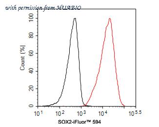 Flow cytometric analysis of F9 cells labeling SOX2. Cells were fixed and permeabilized. Then incubated for 1 hour at +4℃ with SOX2 (HA720179F, red, 1ug/ml). Unlabelled sample was used as a control (cells without incubation with primary antibody; black).