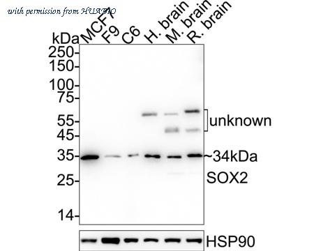 Western blot analysis of SOX2 on different lysates with Rabbit anti-SOX2 antibody (R1106-1) at 1/1,000 dilution. Lane 1: MCF7 cell lysate (20 µg/Lane) Lane 2: F9 cell lysate (20 µg/Lane) Lane 3: C6 cell lysate (20 µg/Lane) Lane 4: Human brain tissue lysate (40 µg/Lane) Lane 5: Mouse brain tissue lysate (40 µg/Lane) Lane 6: Rat brain tissue lysate (40 µg/Lane) Predicted band size: 34 kDa Observed band size: 34 kDa Exposure time: 1 minute; ECL: K1801; 4-20% SDS-PAGE gel. Proteins were transferred to a PVDF membrane and blocked with 5% NFDM/TBST for 1 hour at room temperature. The primary antibody (R1106-1) at 1/1,000 dilution was used in 5% NFDM/TBST at 4℃ overnight. Goat Anti-Rabbit IgG - HRP Secondary Antibody (HA1001) at 1/50,000 dilution was used for 1 hour at room temperature.
