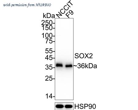 Western blot analysis of SOX2 on different lysates with Chicken anti-SOX2 antibody (HA601499) at 1/5,000 dilution. Lane 1: NCCIT cell lysate Lane 2: F9 cell lysate Lysates/proteins at 15 µg/Lane. Predicted band size: 34 kDa Observed band size: 36 kDa Exposure time: 40 seconds; ECL: K1801; 4-20% SDS-PAGE gel. Proteins were transferred to a PVDF membrane and blocked with 5% NFDM/TBST for 1 hour at room temperature. The primary antibody (HA601499) at 1/5,000 dilution was used in primary antibody dilution (K1803) at 4℃ overnight. Goat Anti-Chicken IgY - HRP Secondary Antibody (HA1046) at 1/50,000 dilution was used for 1 hour at room temperature.