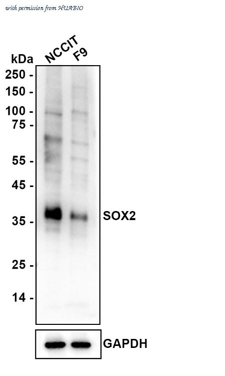 Western blot analysis of SOX2 on different lysates with Chicken anti-SOX2 antibody (HA610329) at 1/5,000 dilution. Lane 1: NCCIT cell lysate Lane 2: F9 cell lysate Lysates/proteins at 15 µg/Lane. Predicted band size: 34 kDa Observed band size: 36 kDa Exposure time: 40 seconds; ECL: K1801; 4-20% SDS-PAGE gel. Proteins were transferred to a PVDF membrane and blocked with 5% NFDM/TBST for 1 hour at room temperature. The primary antibody (HA610329) at 1/5,000 dilution was used in primary antibody dilution (K1803) at 4℃ overnight. Goat Anti-Chicken IgY - HRP Secondary Antibody (HA1046) at 1/50,000 dilution was used for 1 hour at room temperature.