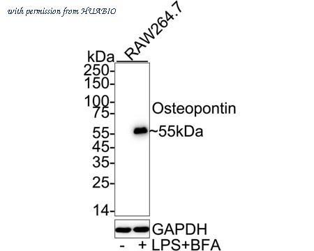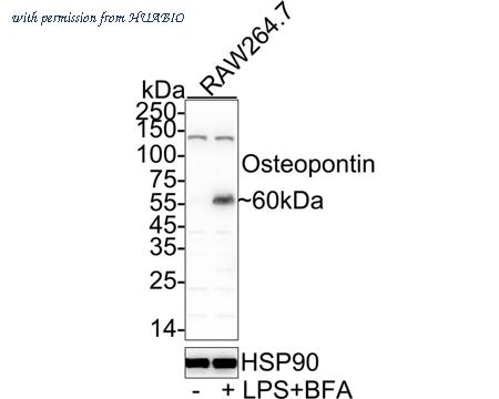 Western blot analysis of Osteopontin on different lysates with Rabbit anti-Osteopontin antibody (HA751278) at 1/2,000 dilution. Lane 1: RAW264.7 cell lysate Lane 2: RAW264.7 treated with 100ng/mL LPS for 4 hours, add 1μg/mL BFA for last 3 hours cell lysate Lysates/proteins at 20 µg/Lane. Predicted band size: 35 kDa Observed band size: 55 kDa Exposure time: 16 seconds; ECL: K1801; 4-20% SDS-PAGE gel. Proteins were transferred to a PVDF membrane and blocked with 5% NFDM/TBST for 1 hour at room temperature. The primary antibody (HA751278) at 1/2,000 dilution was used in 5% NFDM/TBST at 4℃ overnight. Goat Anti-Rabbit IgG - HRP Secondary Antibody (HA1001) at 1/50,000 dilution was used for 1 hour at room temperature.