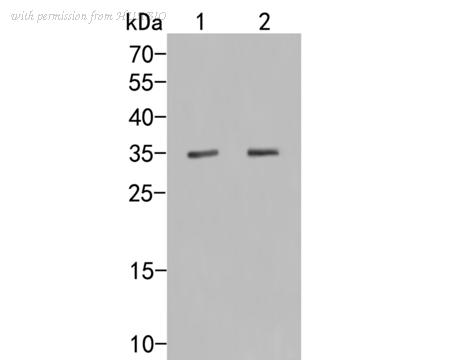 Western blot analysis of Osteopontin on different lysates with Rabbit anti-Osteopontin antibody (0806-6) at 1/1,000 dilution. Lane 1: RAW264.7 cell lysate Lane 2: RAW264.7 treated with 100ng/mL LPS for 4 hours, add 1μg/mL BFA for last 3 hours cell lysate Lysates/proteins at 20 µg/Lane. Predicted band size: 35 kDa Observed band size: 60 kDa Exposure time: 9 seconds; ECL: K1801; 4-20% SDS-PAGE gel. Proteins were transferred to a PVDF membrane and blocked with 5% NFDM/TBST for 1 hour at room temperature. The primary antibody (0806-6) at 1/1,000 dilution was used in 5% NFDM/TBST at 4℃ overnight. Goat Anti-Rabbit IgG - HRP Secondary Antibody (HA1001) at 1/50,000 dilution was used for 1 hour at room temperature.