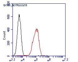 Flow cytometric analysis of Osteopontin was done on 213 cells. The cells were fixed, permeabilized and stained with the primary antibody (HA500464, 1/50) (red). After incubation of the primary antibody at room temperature for an hour, the cells were stained with a Alexa Fluor 488-conjugated Goat anti-Rabbit IgG Secondary antibody at 1/1000 dilution for 30 minutes.Unlabelled sample was used as a control (cells without incubation with primary antibody; black).