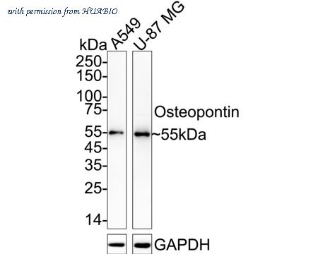Western blot analysis of Osteopontin on different lysates with Rabbit anti-Osteopontin antibody (HA751278) at 1/2,000 dilution. Lane 1: A549 cell lysate Lane 2: U-87 MG cell lysate Lysates/proteins at 20 µg/Lane. Predicted band size: 35 kDa Observed band size: 55 kDa Exposure time: 1 minute; ECL: K1802; 4-20% SDS-PAGE gel. Proteins were transferred to a PVDF membrane and blocked with 5% NFDM/TBST for 1 hour at room temperature. The primary antibody (HA751278) at 1/2,000 dilution was used in 5% NFDM/TBST at 4℃ overnight. Goat Anti-Rabbit IgG - HRP Secondary Antibody (HA1001) at 1/50,000 dilution was used for 1 hour at room temperature.