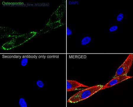 Immunocytochemistry analysis of U-87 MG cells labeling Osteopontin with Rabbit anti-Osteopontin antibody (HA751278) at 1/20,000 dilution. Cells were fixed in 4% paraformaldehyde for 15 minutes at room temperature, permeabilized with 0.1% Triton X-100 in PBS for 15 minutes at room temperature, then blocked with 1% BSA in 10% negative goat serum for 1 hour at room temperature. Cells were then incubated with Rabbit anti-Osteopontin antibody (HA751278) at 1/20,000 dilution in 1% BSA in PBST overnight at 4 ℃. Goat Anti-Rabbit IgG H&L (iFluor™ 488, HA1121) was used as the secondary antibody at 1/1,000 dilution. PBS instead of the primary antibody was used as the secondary antibody only control. Nuclear DNA was labelled in blue with DAPI. Beta tubulin (HA601187, red) was stained at 1/100 dilution overnight at +4℃. Goat Anti-Mouse IgG H&L (iFluor™ 594, HA1126) was used as the secondary antibody at 1/1,000 dilution.