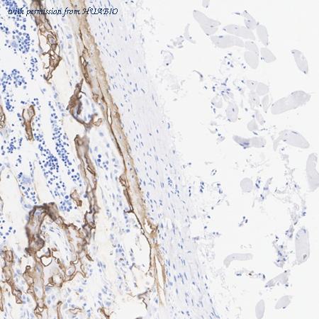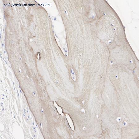 Immunofluorescence analysis of paraffin-embedded human bone tissue labeling Osteopontin with Rabbit anti-Osteopontin antibody (HA751277) at 1/2,000 dilution. The section was pre-treated using heat mediated antigen retrieval with Tris-EDTA buffer (pH 9.0) overnight at 60℃ water bath. The tissues were blocked in 1% BSA for 20 minutes at room temperature, washed with ddH2O and PBS, and then probed with the primary antibody (HA751277) at 1/2,000 dilution for 1 hour at room temperature. The detection was performed using an HRP conjugated compact polymer system. DAB was used as the chromogen. Tissues were counterstained with hematoxylin and mounted with DPX.