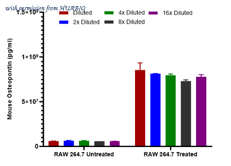 Interpolated concentrations of native spp1 in RAW 264.7 cell extract samples based on a 1000 µg/ml extract load. Capture: HA723924, Mouse Osteopontin Rabbit mAb [PSH17-49] Detector: HA723925, Mouse Osteopontin Rabbit mAb [PSH17-50] Interpolated concentration of native spp1 was measured in duplicate at different sample concentrations. The interpolated dilution factor corrected values were plotted (mean +/- SD, n=2). The mean spp1 concentration was determined to be 79,438,854 pg/ml in RAW 264.7 treated cell extract and 6,041,158 pg/ml in RAW 264.7 untreated cell extract.