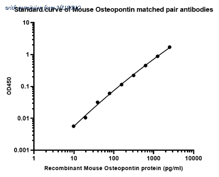 Sandwich ELISA analysis of Mouse Osteopontin matched pair antibodies Capture: HA723924, Mouse Osteopontin Rabbit mAb [PSH17-49] Detector: HA723925, Mouse Osteopontin Rabbit mAb [PSH17-50] Elisa assay was performed by coating wells of a 96-well plate with 100 µl per well of capture antibody (HA723924) diluted in carbonate/bicarbonate buffer, at a concentration of 5 µg/mL overnight at 4℃. Wells of the plate were washed, blocked with 150 µl 0.05% tween-20 1% BSA blocking buffer, and incubated with serial diluted Recombinant Mouse Osteopontin protein (HA210997) protein starting from 2,500 pg/ml to 0 pg/ml and detect antibody (HA723925, Biotin, 0.2 µg/ml) for 1 hour at 30℃ with shaking. Then the plate was washed and incubated with 100 µl per well of SA-HRP for 0.5 hour at 30℃ with shaking. Detection was performed using an Ultra TMB Substrate for 10 minutes at room temperature in the dark. The reaction was stopped with sulfuric acid and absorbances were read on a spectrophotometer at 450 nm.