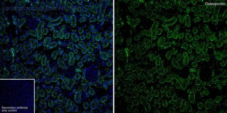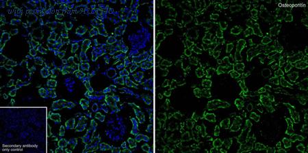 ICC staining Osteopontin in MCF-7 cells (green). The nuclear counter stain is DAPI (blue). Cells were fixed in paraformaldehyde, permeabilised with 0.25% Triton X100/PBS.