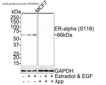 Western blot analysis of Phospho-Estrogen Receptor alpha (S118) on different lysates with Rabbit anti-Phospho-Estrogen Receptor alpha (S118) antibody (ET1610-32) at 1/1,000 dilution. Lane 1: MCF7 whole cell lysate Lane 2: MCF7 treated with 100nM Estradiol for 30 minutes add 100ng/ml EGF for 5 minutes whole cell lysate Lane 3: MCF7 treated with 100nM Estradiol for 30 minutes then treated with 100ng/ml EGF for 5 minutes whole cell lysate Lane 4: MCF7 whole cell lysate treated with λpp for 1 hour Lane 5: MCF7 treated with 100nM Estradiol for 30 minutes add 100ng/ml EGF for 5 minutes whole cell lysate treated with λpp for 1 hour Lane 6: MCF7 treated with 100nM Estradiol for 30 minutes then treated with 100ng/ml EGF for 5 minutes whole cell lysate treated with λpp for 1 hour Lysates/proteins at 20 µg/Lane. Predicted band size: 66 kDa Observed band size: 66 kDa Exposure time: 3 minutes; 4-20% SDS-PAGE gel. Proteins were transferred to a PVDF membrane and blocked with 5% NFDM/TBST for 1 hour at room temperature. The primary antibody (ET1610-32) at 1/1,000 dilution was used in 5% NFDM/TBST at room temperature for 2 hours. Goat Anti-Rabbit IgG - HRP Secondary Antibody (HA1001) at 1:100,000 dilution was used for 1 hour at room temperature.