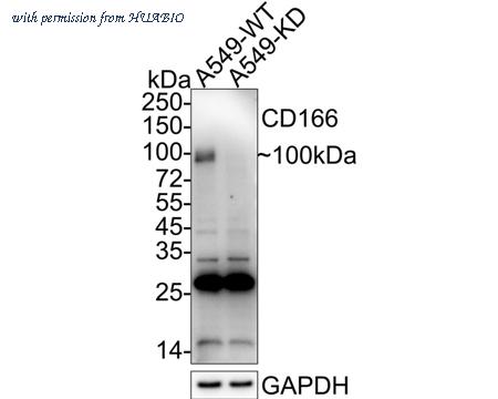Western blot analysis of CD166 on different lysates with Mouse anti-CD166 antibody (HA600082) at 1/2,000 dilution. Lane 1: A549-WT cell lysate Lane 2: A549-KD CD166 cell lysate Lysates/proteins at 10 µg/Lane. Predicted band size: 65 kDa Observed band size: 100 kDa Exposure time: 1 minutes 36 seconds; ECL: K1801; 4-20% SDS-PAGE gel. Proteins were transferred to a PVDF membrane and blocked with 5% NFDM/TBST for 1 hour at room temperature. The primary antibody (HA600082) at 1/2,000 dilution was used in 5% BSA at 4℃ overnight. Goat Anti-Mouse IgG - HRP Secondary Antibody (HA1006) at 1/50,000 dilution was used for 1 hour at room temperature.