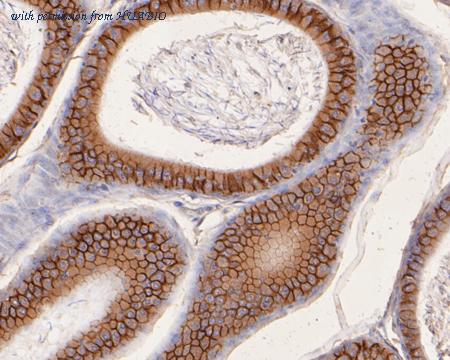 Immunohistochemical analysis of paraffin-embedded rat bladder tissue using anti-CD166 antibody. The section was pre-treated using heat mediated antigen retrieval with Tris-EDTA buffer (pH 8.0-8.4) for 20 minutes.The tissues were blocked in 5% BSA for 30 minutes at room temperature, washed with ddH2O and PBS, and then probed with the primary antibody (M1012-7, 1/100) for 30 minutes at room temperature. The detection was performed using an HRP conjugated compact polymer system. DAB was used as the chromogen. Tissues were counterstained with hematoxylin and mounted with DPX.