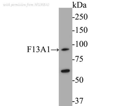Western blot analysis of F13A1 on human placenta tissue lysates. Proteins were transferred to a PVDF membrane and blocked with 5% BSA in PBS for 1 hour at room temperature. The primary antibody (EM1901-39, 1/500) was used in 5% BSA at room temperature for 2 hours. Goat Anti-Mouse IgG - HRP Secondary Antibody (HA1006) at 1:5,000 dilution was used for 1 hour at room temperature.
