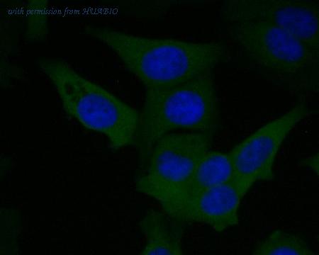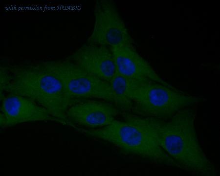 ICC staining of F13A1 in MG-63 cells (green). Formalin fixed cells were permeabilized with 0.1% Triton X-100 in TBS for 10 minutes at room temperature and blocked with 1% Blocker BSA for 15 minutes at room temperature. Cells were probed with the primary antibody (EM1901-39, 1/50) for 1 hour at room temperature, washed with PBS. Alexa Fluor®488 Goat anti-Mouse IgG was used as the secondary antibody at 1/1,000 dilution. The nuclear counter stain is DAPI (blue).