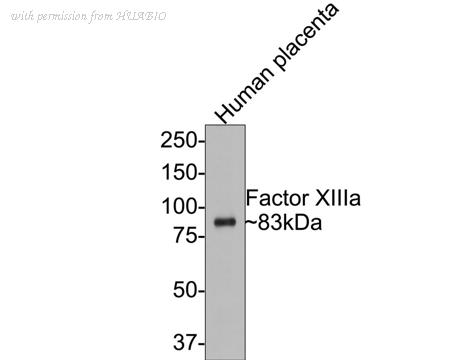Western blot analysis of Factor XIIIa on human placenta tissue lysates with Rabbit anti-Factor XIIIa antibody (HA721148) at 1/500 dilution. Lysates/proteins at 20 µg/Lane. Predicted band size: 83 kDa Observed band size: 83 kDa Exposure time: 2 minutes; 8% SDS-PAGE gel. Proteins were transferred to a PVDF membrane and blocked with 5% NFDM/TBST for 1 hour at room temperature. The primary antibody (HA721148) at 1/500 dilution was used in 5% NFDM/TBST at room temperature for 2 hours. Goat Anti-Rabbit IgG - HRP Secondary Antibody (HA1001) at 1:300,000 dilution was used for 1 hour at room temperature.