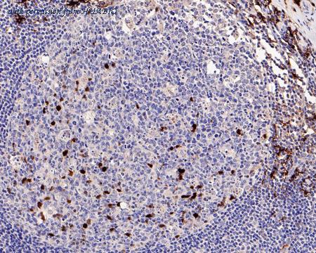 Immunohistochemical analysis of paraffin-embedded human lymph nodes tissue with Rabbit anti-Factor XIIIa antibody (HA721148) at 1/1,000 dilution. The section was pre-treated using heat mediated antigen retrieval with Tris-EDTA buffer (pH 9.0) for 20 minutes. The tissues were blocked in 1% BSA for 20 minutes at room temperature, washed with ddH2O and PBS, and then probed with the primary antibody (HA721148) at 1/1,000 dilution for 1 hour at room temperature. The detection was performed using an HRP conjugated compact polymer system. DAB was used as the chromogen. Tissues were counterstained with hematoxylin and mounted with DPX.