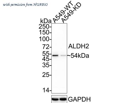 Western blot analysis of ALDH2 on different lysates with Mouse anti-ALDH2 antibody (HA610152) at 1/1,000 dilution. Lane 1: A549-WT cell lysate Lane 2: A549-KD ALDH2 cell lysate Lysates/proteins at 10 µg/Lane. Predicted band size: 56 kDa Observed band size: 54 kDa Exposure time: 52 seconds; ECL: K1801; 4-20% SDS-PAGE gel. Proteins were transferred to a PVDF membrane and blocked with 5% NFDM/TBST for 1 hour at room temperature. The primary antibody (HA610152) at 1/1,000 dilution was used in 5% BSA at 4℃ overnight. Goat Anti-Mouse IgG - HRP Secondary Antibody (HA1006) at 1/50,000 dilution was used for 1 hour at room temperature.