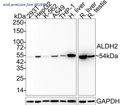 Western blot analysis of ALDH2 on different lysates with Mouse anti-ALDH2 antibody (M1501-7) at 1/1,000 dilution. Lane 1: 293T cell lysate (20 µg/Lane) Lane 2: HepG2 cell lysate (20 µg/Lane) Lane 3: K-562 cell lysate (20 µg/Lane) Lane 4: A549 cell lysate (20 µg/Lane) Lane 5: THP-1 cell lysate (20 µg/Lane) Lane 6: Human liver tissue lysate (40 µg/Lane) Lane 7: Mouse liver tissue lysate (40 µg/Lane) Lane 8: Rat liver tissue lysate (40 µg/Lane) Lane 9: Rat testis tissue lysate (40 µg/Lane) Predicted band size: 56 kDa Observed band size: 54 kDa Exposure time: 1 minute 30 seconds; 4-20% SDS-PAGE gel. Proteins were transferred to a PVDF membrane and blocked with 5% NFDM/TBST for 1 hour at room temperature. The primary antibody (M1501-7) at 1/1,000 dilution was used in 5% NFDM/TBST at 4℃ overnight. Goat Anti-Mouse IgG - HRP Secondary Antibody (HA1006) at 1/50,000 dilution was used for 1 hour at room temperature.