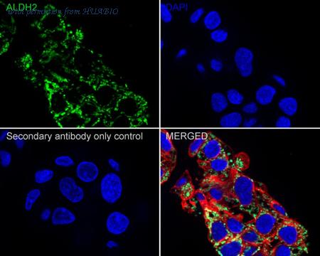 Immunocytochemistry analysis of HepG2 cells labeling ALDH2 with Mouse anti-ALDH2 antibody (HA610152) at 1/100 dilution. Cells were fixed in 4% paraformaldehyde for 20 minutes at room temperature, permeabilized with 0.1% Triton X-100 in PBS for 5 minutes at room temperature, then blocked with 1% BSA in 10% negative goat serum for 1 hour at room temperature. Cells were then incubated with Mouse anti-ALDH2 antibody (HA610152) at 1/100 dilution in 1% BSA in PBST overnight at 4 ℃. Goat Anti-Mouse IgG H&L (iFluor™ 488, HA1125) was used as the secondary antibody at 1/1,000 dilution. PBS instead of the primary antibody was used as the secondary antibody only control. Nuclear DNA was labelled in blue with DAPI. beta Tubulin (ET1602-4, red) was stained at 1/100 dilution overnight at +4℃. Goat Anti-Rabbit IgG H&L (iFluor™ 594, HA1122) were used as the secondary antibody at 1/1,000 dilution.