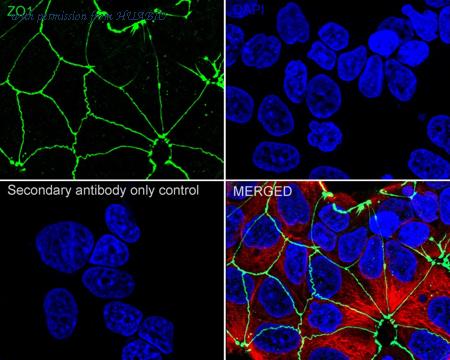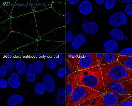 Immunocytochemistry analysis of MCF7 cells labeling ZO1 with Rabbit anti-ZO1 antibody (HA751131) at 1/2,000 dilution. Cells were fixed in 4% paraformaldehyde for 20 minutes at room temperature, permeabilized with 0.1% Triton X-100 in PBS for 5 minutes at room temperature, then blocked with 1% BSA in 10% negative goat serum for 1 hour at room temperature. Cells were then incubated with Rabbit anti-ZO1 antibody (HA751131) at 1/2,000 dilution in 1% BSA in PBST overnight at 4 ℃. Goat Anti-Rabbit IgG H&L (iFluor™ 488, HA1121) was used as the secondary antibody at 1/1,000 dilution. PBS instead of the primary antibody was used as the secondary antibody only control. Nuclear DNA was labelled in blue with DAPI. Beta tubulin (M1305-2, red) was stained at 1/100 dilution overnight at +4℃. Goat Anti-Mouse IgG H&L (iFluor™ 594, HA1126) was used as the secondary antibody at 1/1,000 dilution.