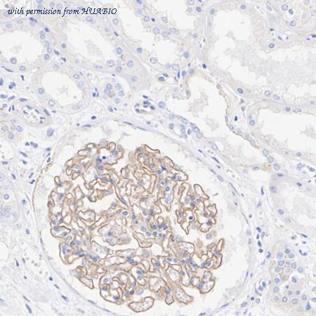 Immunohistochemical analysis of paraffin-embedded human kidney tissue with Rabbit anti-ZO1 antibody (ER41204) at 1/10,000 dilution. The section was pre-treated using heat mediated antigen retrieval with Tris-EDTA buffer (pH 9.0) for 20 minutes. The tissues were blocked in 1% BSA for 20 minutes at room temperature, washed with ddH2O and PBS, and then probed with the primary antibody (ER41204) at 1/10,000 dilution for 1 hour at room temperature. The detection was performed using an HRP conjugated compact polymer system. DAB was used as the chromogen. Tissues were counterstained with hematoxylin and mounted with DPX.