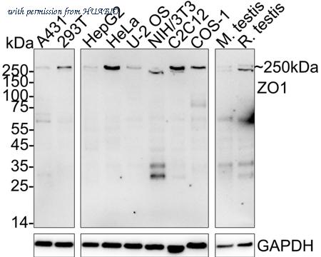 Western blot analysis of ZO1 on different lysates with Rabbit anti-ZO1 antibody (HA751131) at 1/1,000 dilution. Lane 1: A431 cell lysate (20 µg/Lane) Lane 2: 293T cell lysate (20 µg/Lane) Lane 3: HepG2 cell lysate (20 µg/Lane) Lane 4: HeLa cell lysate (20 µg/Lane) Lane 5: U-2 OS cell lysate (20 µg/Lane) Lane 6: NIH/3T3 cell lysate (20 µg/Lane) Lane 7: C2C12 cell lysate (20 µg/Lane) Lane 8: COS-1 cell lysate (20 µg/Lane) Lane 9: Mouse testis tissue lysate (40 µg/Lane) Lane 10: Rat testis tissue lysate (40 µg/Lane) Predicted band size: 195 kDa Observed band size: 250 kDa Exposure time: 3 minutes; ECL: K1802; 4-20% SDS-PAGE gel. Proteins were transferred to a PVDF membrane and blocked with 5% NFDM/TBST for 1 hour at room temperature. The primary antibody (HA751131) at 1/1,000 dilution was used in 5% NFDM/TBST at 4℃ overnight. Goat Anti-Rabbit IgG - HRP Secondary Antibody (HA1001) at 1/50,000 dilution was used for 1 hour at room temperature.